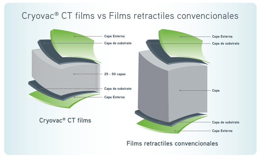 Las poliolefinas termocontraibles Cryovac® son sumamente efectivas a la hora de copiar la superficie de los productos envueltos. La alta capacidad de contracción mejora notablemente el aspecto de los paquetes.
